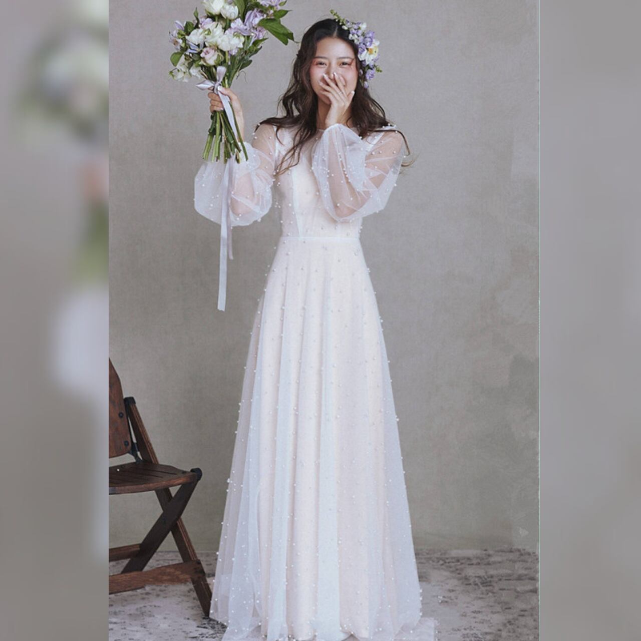 ウェディングドレス 花嫁 結婚式 前撮り 2次会 後撮り ウェディングフォト 10代 20代 30代 40代 人気 シンプル ナチュラル ロングドレス ブライダル ドレス パーティー 海外挙式 深めVネック ホワイト 韓国スタイル