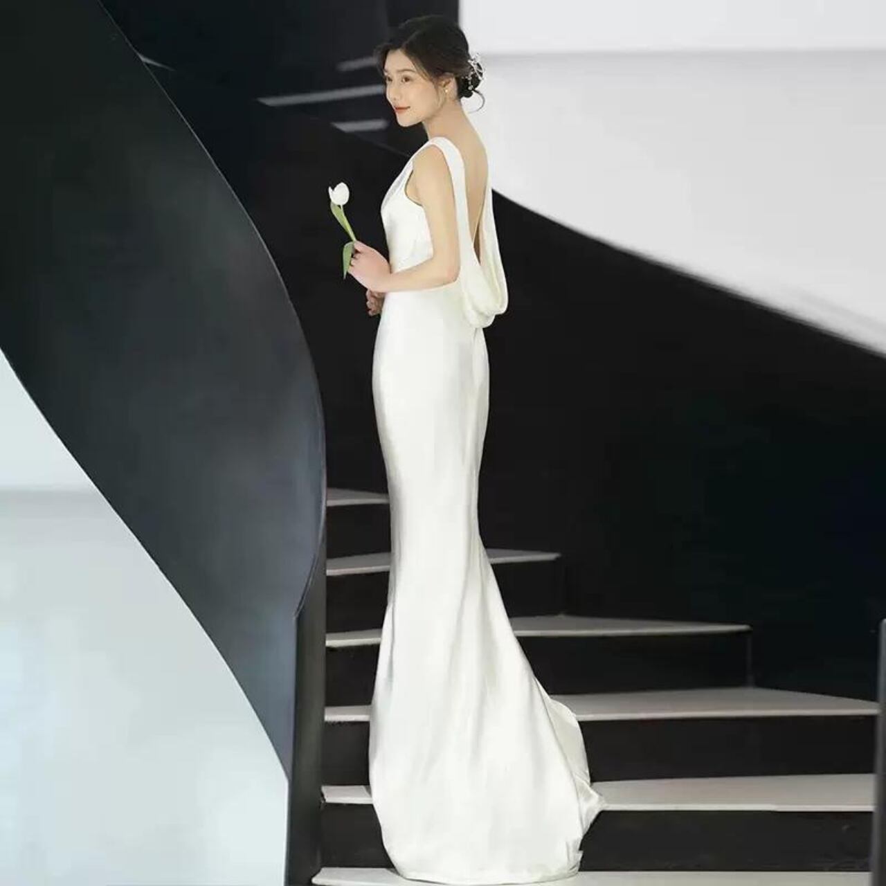 ウェディングドレス 花嫁 結婚式 前撮り 2次会 後撮り ウェディングフォト 10代 20代 30代 40代 人気 シンプル ナチュラル ロングドレス ブライダル ドレス パーティー 海外挙式 深めのVネック ホワイト ドレープ